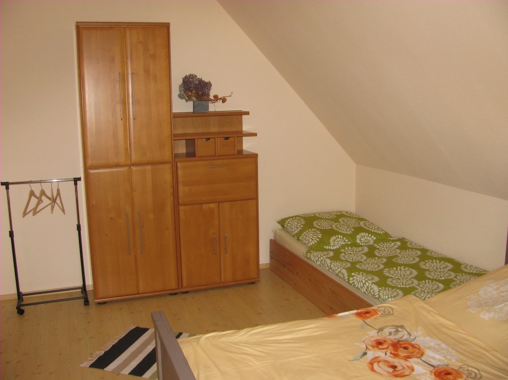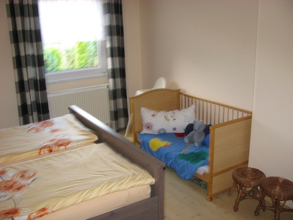In dem größeren 1. Schlafzimmer befindet sich ein großes Doppelbett sowie (falls gewünscht) ein Kinderbettchen, außerdem ein Einzelbett und Kleiderschrank.